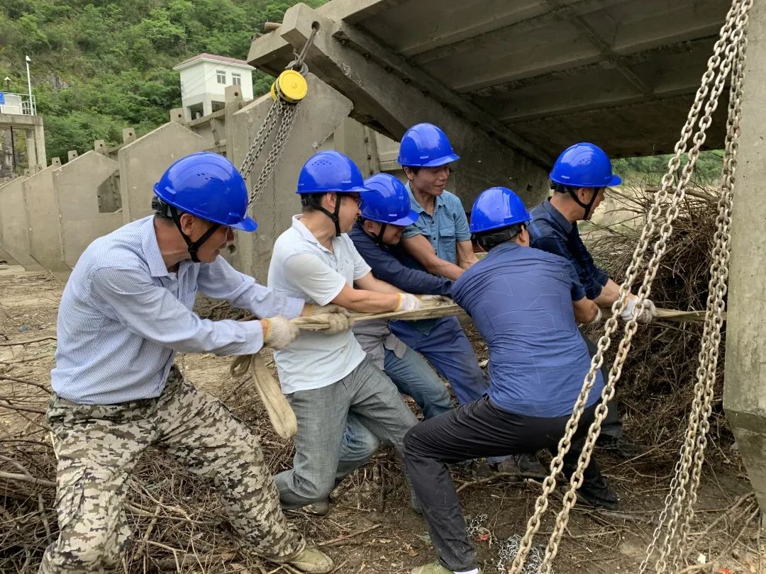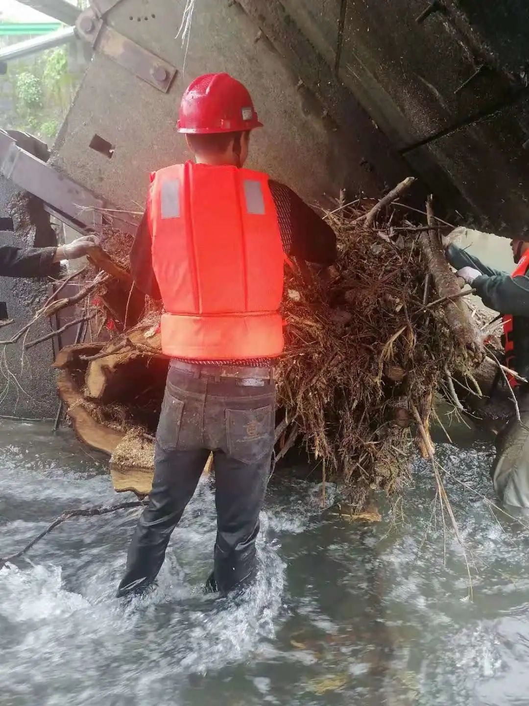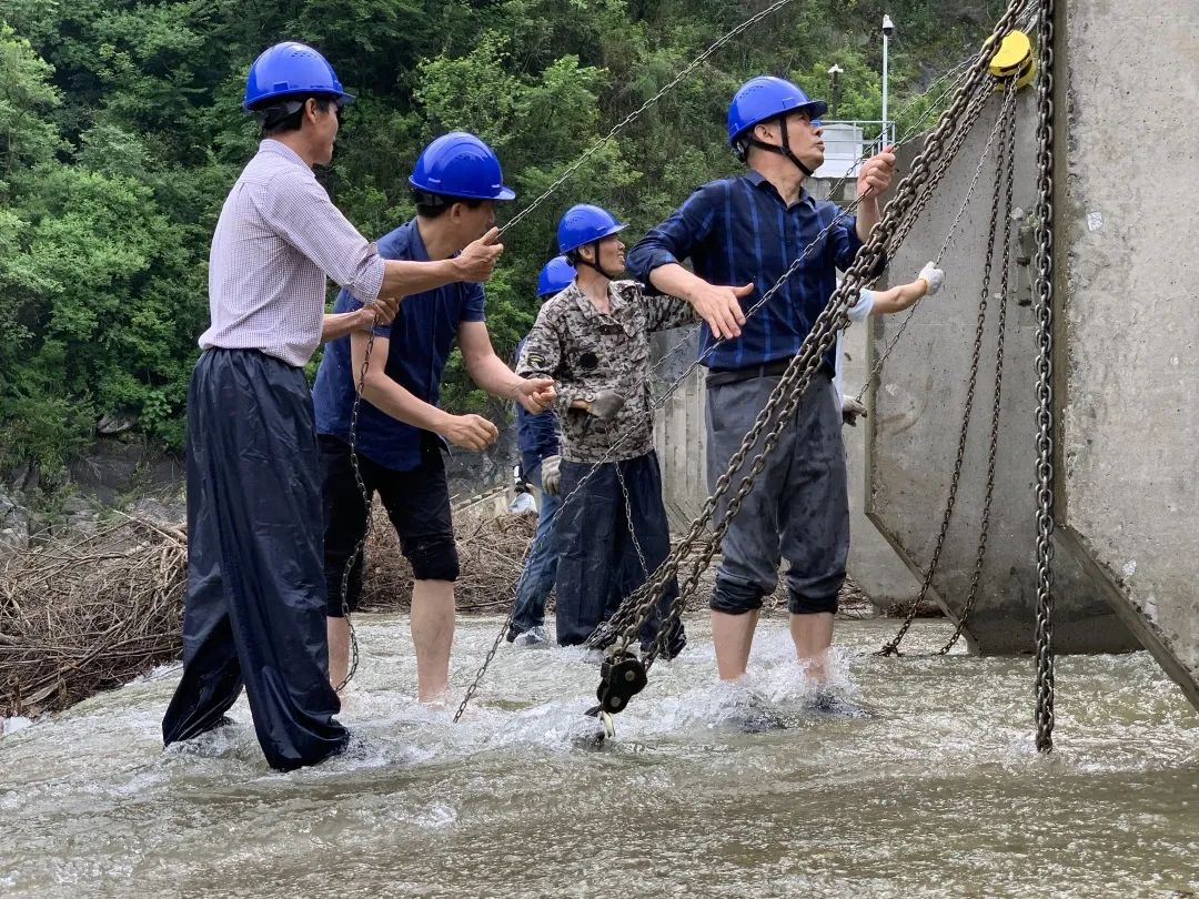 自5月以来,大别山区、皖南山区阴雨连绵,ok138cn太阳集团古天乐所属电站雨量丰沛,但同时导致各电站河道内的枯枝杂草、浮游垃圾增多,特别是霍山县将军石水电站和祁门县历口水电站,由于上游洪水使大量树枝树头冲到下游,卡堵住翻板坝,导致翻板坝无法自动复位,大坝漏水严重。