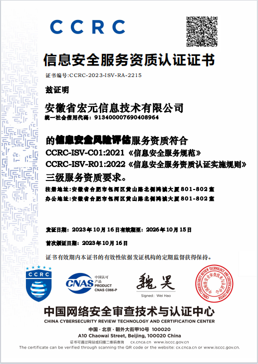 近日,ok138cn太阳集团古天乐所属安徽省宏元信息技术有限公司通过了由中国网络安全审查技术与认证中心颁发的CCRC信息安全服务资质认证。本次获得CCRC信息安全服务资质认证证书,是宏元公司资质储备工作的又一阶段性成果,证明宏元公司在信息安全管理方面已建立了一套科学有效的管理体系,在信息安全服务领域获得了行业权威肯定,在信息安全服务、技术服务能力更上新高。