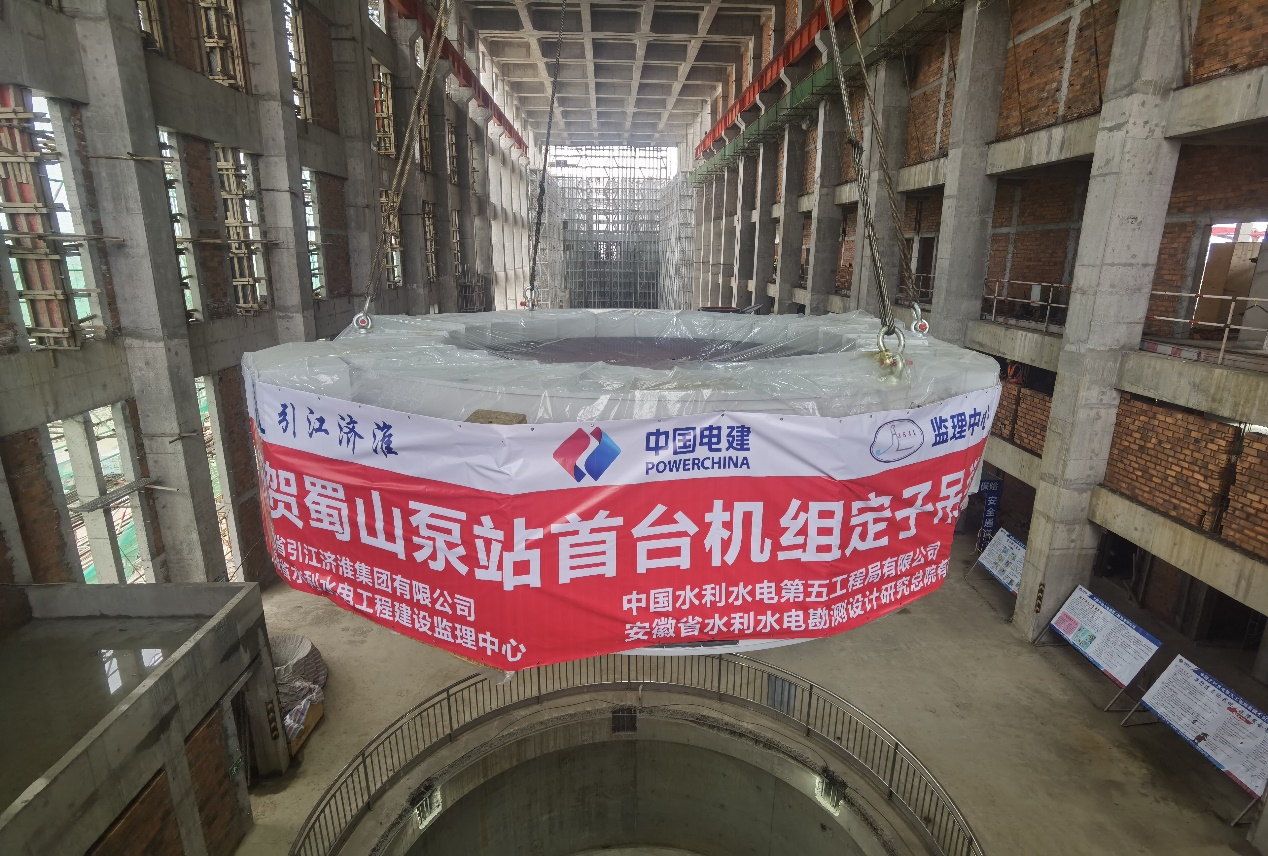 3月31日,ok138cn太阳集团古天乐所属禹顺公司承担监理的亚洲在建装机、流量最大的混流泵站—引江济淮蜀山枢纽首台单机功率7500kW水泵机组定子成功吊装入位,为后续机组安装奠定坚实基础。